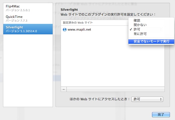 上の黒い背景の別ウィンドウを表示した状態のままで、Safariのメニューから環境設定>セキュリティタブを選び、再度「Webサイト設定を管理」ボタンをクリックして、Silverlightの項目を選択します。すると今度は以下のように設定済みのWebサイトにwww.mapli.netが追加されていますので、コンボボックスから「安全でないモードで実行」を選択します。